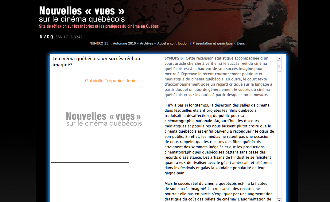 Cinéma québécois: un succès réel ou imaginé. 2008. Nouvelles “Vues” sur le cinéma québécois, vol 9. URL