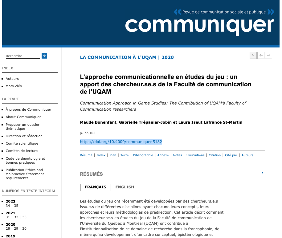 A Communicational Approach in Game Studies (Original in French: L’approche communicationnelle en études du jeu : un apport des chercheur.se.s de la Faculté de communication de l’UQAM) (avec Maude Bonenfant et Laura Iseut Lafrance St-Martin). 2020, Communiquer. Numéro La communication à l’UQAM. 50 ans d’audace. URL