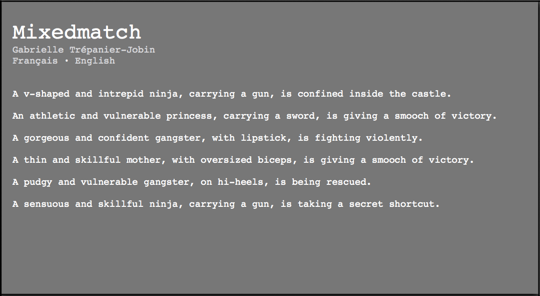 MixedMatch (2015) is a program code that generates queer video game narratives by randomly combining moral characteristics, physical attributes, and social roles usually associated to either male or female avatars in video games. This digital artwork is intended to show how different video game narratives could be if they were not regulated by arbitrary and socially constructed norms of femininity and masculinity. Accessible online at the address http://www.mixtematch.com, this program code is a personal adaptation of an open-source HTML code created by Nick Montfort (professor at MIT and director of the Trope Tank).